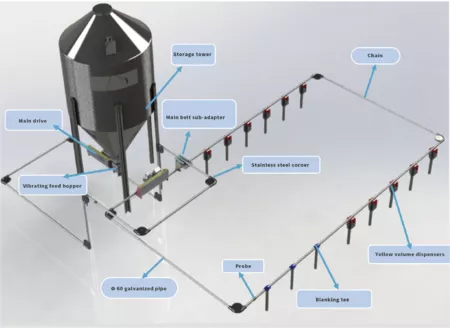 Feed line: 20Mn2 chain and connector, high tensile strength, low elongation, and zero tripping. The cleaning sheet of feed pipe can reduce the feed residue on the pipe wall, avoiding the false action of the probe, being conducive to biological safety.