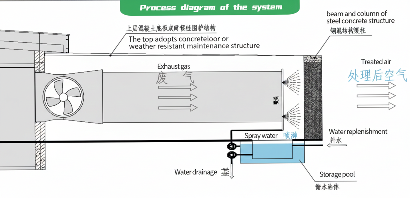 After the exhaust gas in the pig house is drawn out through positive or negative pressure, the polypropylene filter screen is wetted by the spray pipeline with a certain spray intensity. The circulating water is regularly replaced according to the monitoring prompts of the water quality detection system ,achieving the purpose of deodorization and dust reduction.
